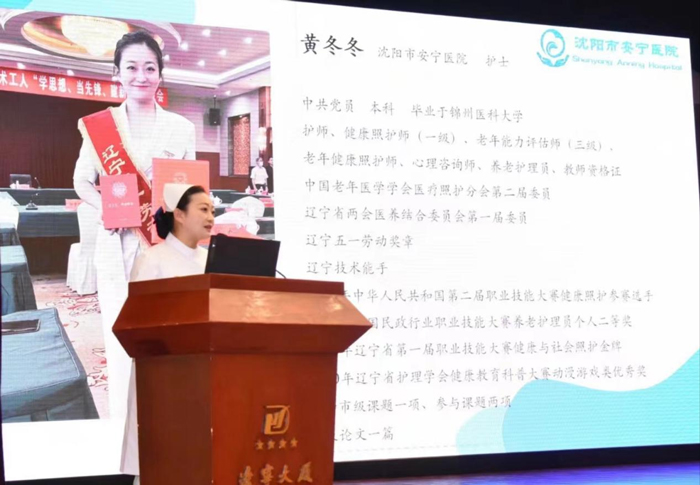 会上,黄冬冬作为辽宁省优秀护理工作者典型代表进行事迹报告,代表医院以《担职业之荣光·书写承诺·给未来的自己》的主题报告,充分展现了沈阳市安宁医院护理人员的新风采、新形象、新服务。在安宁医院,老年患者和精神疾病患者,是护理人员工作最常面对的两类人群。黄冬冬为与会人员分享一些真实的故事,让大家更好的了解“安宁人”。